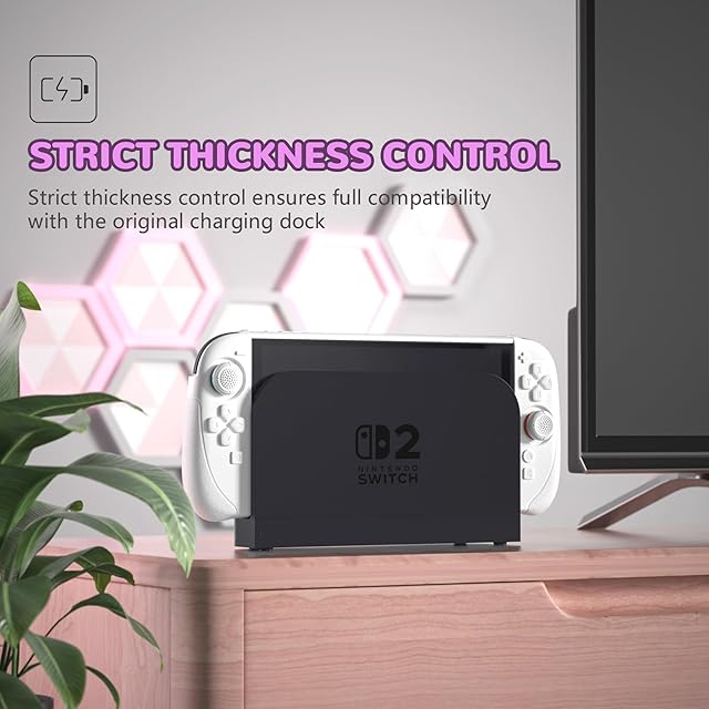 Nintendo Switch 2専用設計の多機能グリップケースセットで、ゲーム体験をワンランクアップ!ご注意:他のモデル(初代Switch/OLEDモデル)には対応しておりません。ご購入前に機種をご確認ください。<br> 本製品は、柔らかく弾力性のあるシリコン素材を使用したフルカバージョイコングリップを備えており、不意の衝撃や落下から本体をしっかり保護します。<br> 滑りにくく握りやすい設計で、長時間の携帯モードでも快適にプレイでき、手の疲れを軽減します。<br> 背面には高耐久PC素材のカバーを採用し、日常使用による擦り傷や衝撃から本体を守ります。スリムな設計ながらも高い保護性能を備え、さらにドック対応設計によりケースを装着したまま充電が可能です。<br> 付属の角度調整スタンドは、45°〜75°まで5段階(45°、52.5°、60°、67.5°、75°)の調整ができ、テーブルモードでのゲームや動画視聴にも最適です。<br><br> 【セット内容】<br> Switch 2専用 シリコングリップ(左右)*1ペア<br> 親指グリップキャップ*2ペア(凹型&凸型)<br> PC製 背面カバー*1<br> 5段階調整式スタンド*1<br><br> ご注意:本体、Joy-Con、ドック、その他アクセサリーは付属しておりません。