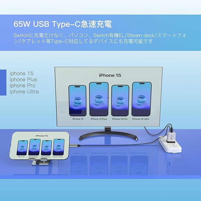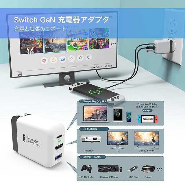【GaN急速充電アダプター】新素材GaN(窒化ガリウム)を採用し、65Wの高出力を提供するながらMacBookの61W純正アダプターよりもコンパクトで、約52% の小型化を実現しました。 Switchゲーム機、ノートパソコン、アンドロイド携帯電話、アップルパソコン、タブレットパソコン、その他のUSB-Cデバイスを急速に充電することができる。スイッチは手持ちモードでゲームをする際に十分な電力供給を維持する(入力:100-240 V 50/60 Hz、最大出力:20 V=3 A)