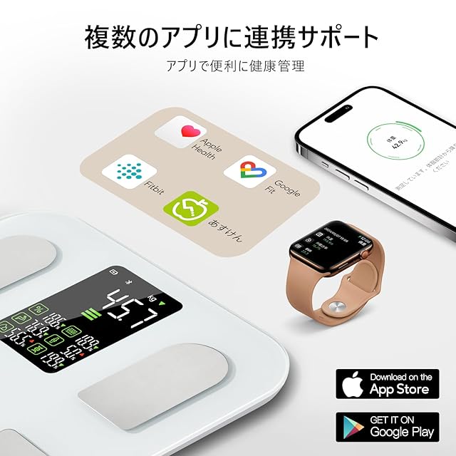 【多役なヘルスメーター&様々なアプリ連携】体重計は5kg-150kgまで対応、子供から大人各種体型に対応、専用アプリに連動だけでなく、apple watch/Appleヘルスケア/Google Fit/Fitbit、“あすけん”にも連携で体の変化を追跡できる、体型管理に役立つデータをまとめて管理できます。専用アプリに登録するだけで友達の追加や飲食記録などの機能が使える体組成計。