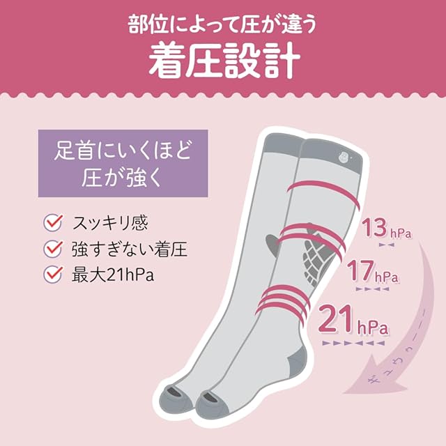 MとLの2サイズ。足首やふくらはぎの太さに合わせて使える2サイズ。ご自身に最適なサイズをお選びください。Mサイズ:ふくらはぎ周囲30-40㎝ 足首周囲19-23㎝ 足サイズ22-24㎝