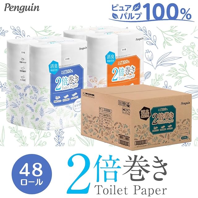 アイリスプラザ(IRIS PLAZA) 【ケース販売】 ペンギントイレットペーパー シングル 100m 12ロール(実質96ロール分) 2倍巻き ピュアパルプ 切り取り線 エンボス加工 消臭機能 芯あり 肌触り 柔らか