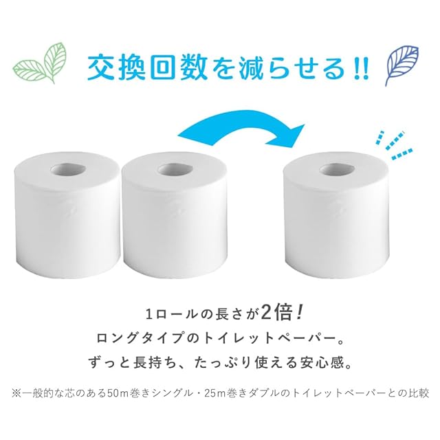 ※一般的な芯のある50m巻きシングルトイレットロールとの比較。