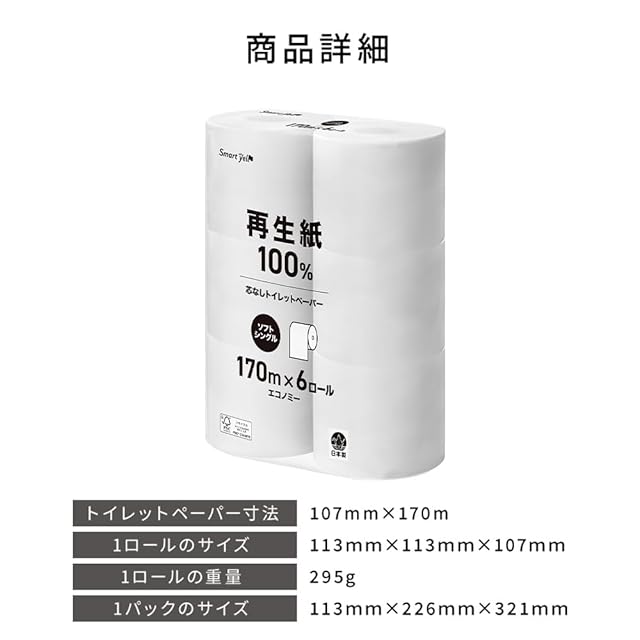 商品名:アイリスプラザ(IRIS PLAZA) 【8個セット】 トイレットペーパー シングル 170m×6ロール 3倍巻き 国産 スマートエール