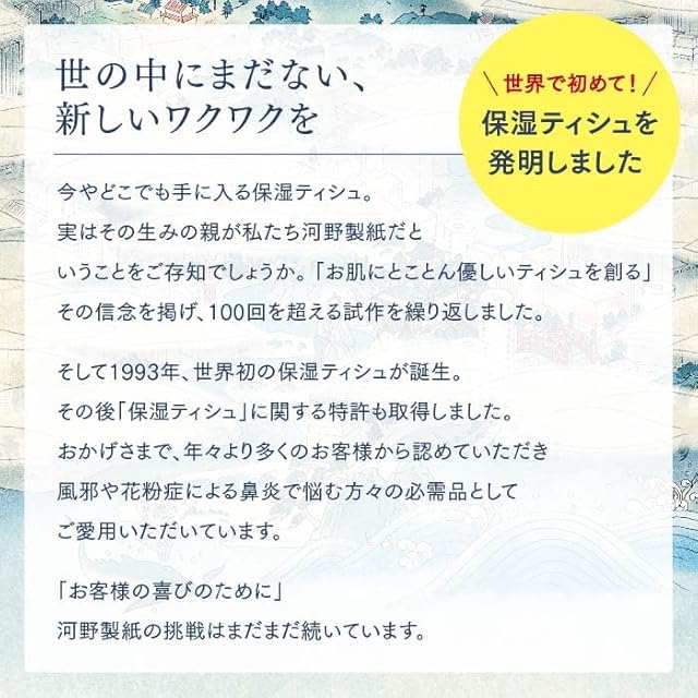 絹のよう! ゲル状保湿! しっとりなめらかで シルクのような肌触りの 保湿トイレットペーパー 業界初!絹のようになめらかでやわらかくお肌にやさしい トイレットペーパーです。 実感してください。やめられません! ●ゲル状のモイスチャー成分によって、空気中の水分をたくわえ、 常に安定したやわらかさと絹のようななめらかさを実感してください。 お肌、おしりへの負担を半分に軽減。 トイレでの毎日の患部の辛い痛みが軽減されます。 もちろん女性のデリケートな時期にも心からうれしい、 まるで絹のようなソフトさです。 シャワートイレにも最適。吸収量も普通のトイレットの2倍以上(当社比) きれいにコーティングしたブルーデザインのパッケージは 清潔感が躍動しています。 ●純高級カナダ産パルプ100%の中からバランスの良い 配合だけを選びました。 ●日本古来の手作りの紙を漉きあげる手漉き和紙の技術 で、 キメの細やかな紙肌を実感してください。 ●材質:包材、ポリプロピレン/トイレットペーパー、パルプ100% ●1ケース 4ロール2枚重ね30m*20入り シルクのような4R 298円 ━━━━━━━━━━━━━ キーワード:トイレットペーパー ━━━━━━━━━━━━━