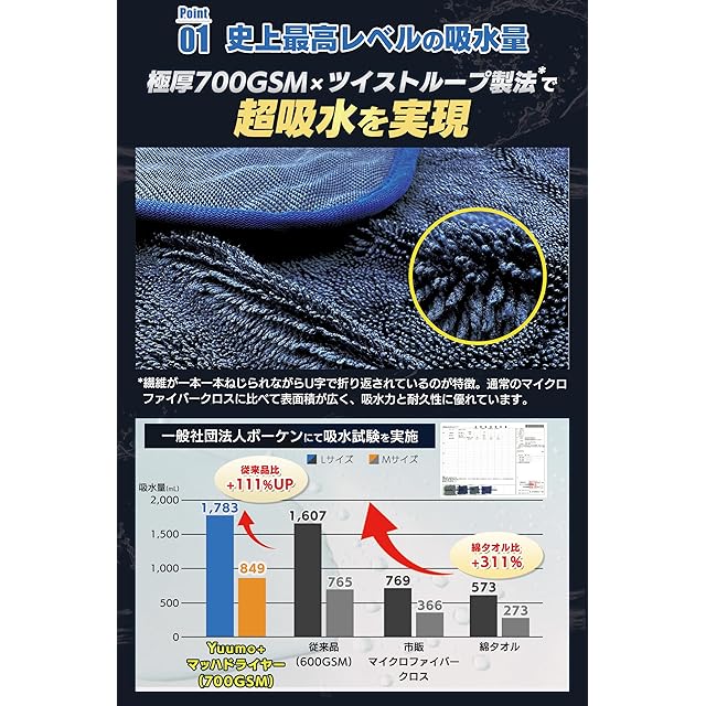 ✅【史上最高レベルの超吸水力*】極厚700GSM×ツイストループ製法のマイクロファイバータオルが水滴を一瞬でキャッチし、水垢を残さず、愛車の表面を素早く拭き取ります。吸水量はMサイズ:849mL、Lサイズ:1,783mLと従来品(600GSM)比+111%アップ、市販マイクロファイバークロス比+232%、綿タオル比+311%(一般社団法人ボーケンにて吸水試験実施。*当社従来品比)。洗車タオルの縁部分は、柔らかくて車の表面を傷つけにくい弾力性の高いナイロン生地で縫製。塗装やコーティングなどの表面を傷つける心配もありません。