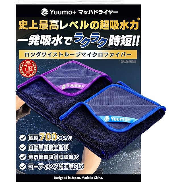 ✅【史上最高レベルの超吸水力*】極厚700GSM×ツイストループ製法のマイクロファイバータオルが水滴を一瞬でキャッチし、水垢を残さず、愛車の表面を素早く拭き取ります。吸水量はMサイズ:849mL、Lサイズ:1,783mLと従来品(600GSM)比+111%アップ、市販マイクロファイバークロス比+232%、綿タオル比+311%(一般社団法人ボーケンにて吸水試験実施、*当社従来品比)。タオルの縁部分は、柔らかくて車の表面を傷つけにくい弾力性の高いナイロン生地で縫製。塗装やコーティングなどの表面を傷つける心配もありません。 ✅【拭き上げ時間を約1/3にラクラク時短化】独自のロングツイストループ製法で、市販マイクロファイバークロスと比較し、優れた吸水力・耐久性を実現。拭き上げ時間は市販マイクロファイバークロスと比較し、約1/3に短縮。洗車時間短縮&疲労軽減でお手軽に洗車できるため、愛車をいつもピカピカな状態に保てます。いつものドライブがより楽しくなり、あなたのカーライフをさらに充実させること間違いなし。 ✅【自動車整備士が監修】某大手ディーラーの現役自動車整備士「川上 凌駕」氏が監修。機能性・サイズ・品質・デザインなどのアドバイスをもらい、改良を重ねた結果、圧倒的なこだわりの洗車タオルが製品化されました。川上整備士コメント「吸水性は申し分なく、隙間に入った水も吸い取ってくれます。柔らかさも大きさもちょうど良く、拭き上げの時短化により疲労も軽減できるのでオススメです!」と大絶賛。プロ推薦の大判洗車用タオルです。 ✅【商品詳細】●同梱物:洗車タオル、使用方法&お手入れガイド×1、厚手スライド式チャック収納袋×1 ●Mサイズ:横60×縦50cm ●Lサイズ:横90×縦70cm ●生地厚さ:700GSM ●カラー:タオル生地:ネイビー・縁:ブルー ●素材:ポリエステル80%・ナイロン20% ●お手入れ方法:洗濯機・手洗い〇、乾燥機×、中性洗剤〇、漂白剤・柔軟剤×、洗濯後は風通しの良い場所で陰干しで乾燥させてください(天日干しの場合はタオル地を内側にして乾燥させてください)。 ✅【安心の180日間品質】アフターサポート用の公式LINE窓口(日本人対応)を用意しており、サポート体制は万全です。万が一、商品に不具合がございましたら、直ぐにご連絡ください。最後まで誠心誠意対応させていただきます。