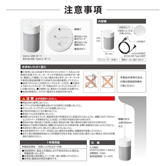 本製品は車載用の噴霧式フレグランスディフューザーです。フレグランスオイルを高圧で噴霧し、瞬時に香りが広がります。