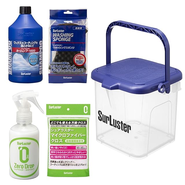 Surluster(シュアラスター) 洗車バケツセット5点 カーシャンプー1000 x1個 ウォッシングスポンジx1個 ゼロドロップ150mlx1個 マイクロファイバークロスx1枚 洗車バケツx1個【セット買い】