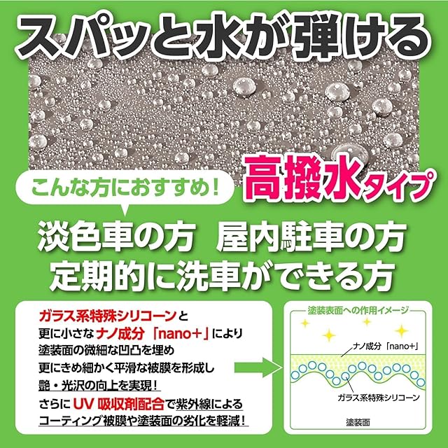 ゼロドロップ:ナノ成分"nano+"を配合した、新しいガラス系ナノコーティング。洗車後、スプレーして拭くだけ。ムラの心配も少なく、誰でも簡単。