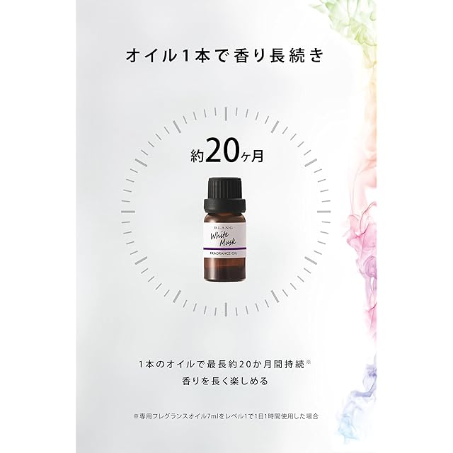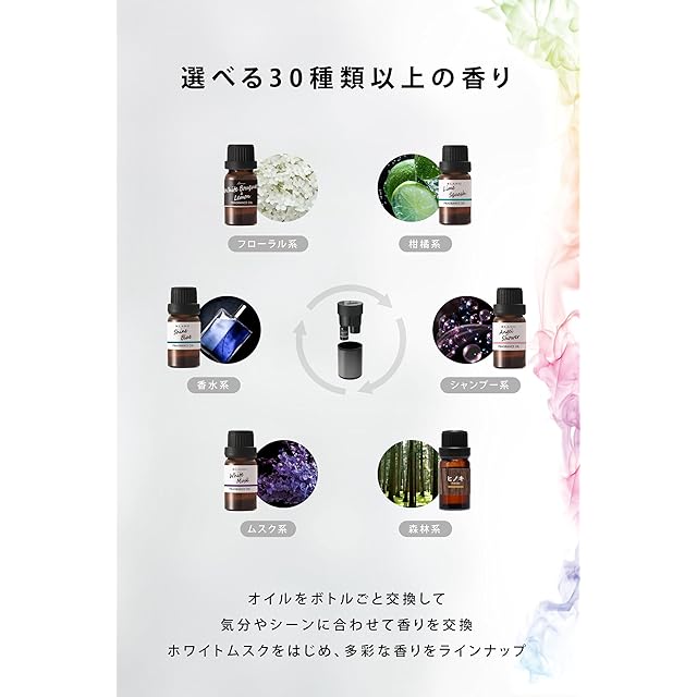 【香りの交換も簡単】ボトルを交換するだけで、簡単に香りをチェンジできるので、気分やシーンに合わせて香りを選べます。専用ボトルの香りは、ホワイトムスクをはじめ、多彩にラインナップしています。すべてのモードで2時間オートオフ機能を搭載しているため、消し忘れの心配がありません。