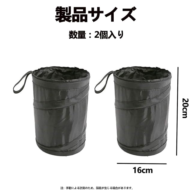【製品仕様】この車載ゴミ箱の高さは20cm、底の直径は16cm、重さは約60グラムです。折りたたんだ時のサイズは一般的な車用ゴミ箱の約1/10で、軽量で持ち運びが簡単、収納にも場所をとらず、カーライフをより快適にします。セットには、すべての要件を満たす人間化されたデザインの黒いゴミ箱が 2 個含まれています。車内の保管や整理に役立ちます。