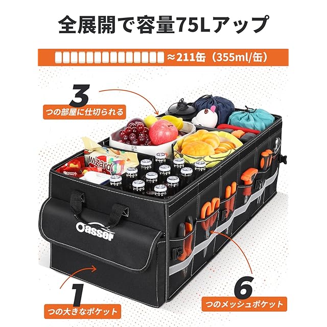 仕切り付きで自由にカスタマイズ:75Lの大容量設計で、6つのメッシュポケットが付いて、タオルや工具、車内小物などをすっきり収納可能。SUVなどのトランクスペースが広い車両に適し、大容量の収納が可能です。仕切り板が3枚付属しており、収納スペースを自由に調整できます。全展開サイズ:74×37×28cm