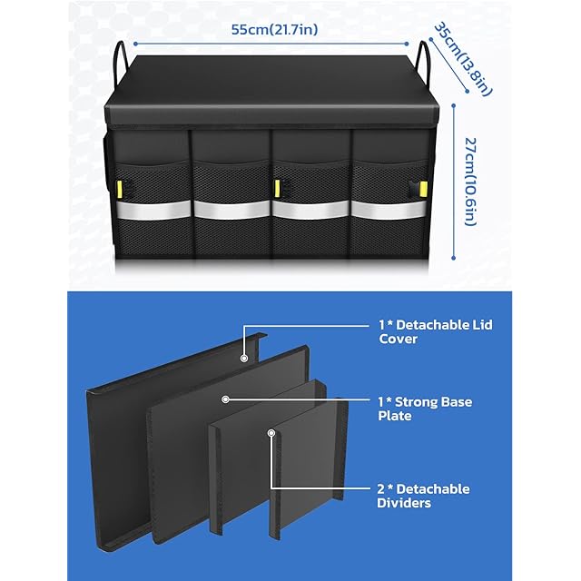 Oasser E3A 車用収納ボックス トランクボックス トランク ラゲッジルーム 収納</br>大容量 折り畳み式 仕切り付き 取っ手 反射シール マジックテープ滑り止め カーバー付</br>製品紹介</br>600Dオックスフォード防水生地使用、丈夫で崩れにくい、傷つきにくい、洗浄しやすい</br>仕切り2枚あり、需要に応じ空間カスタマイズできる、使わない時は畳むことでスペースを節約できる、半分畳んで半分使うことだって可能</br>底部にマジックテープ式滑り止めがあり、走行中勝手な移動を防ぐ</br>4つのサイドポケットがあり、小物などを入れられる、トランクをスッキリにる</br>カーバーが付属され、防塵な上にプライバシーも守れる