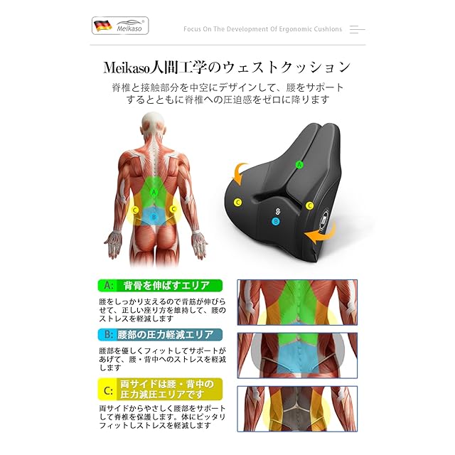 【創り上げる理想的な美姿勢】Meikasoは累計販売データと数年間の繰り返しのテストによりモダンファッションと購買ニーズが合う腰クッションをデザインしました。採用したドイツ輸入のメモリーコットンは体のカーブとぴったりフィットできて、シートと背中の隙間を埋めて、腰部の両サイドから包み込んでサポートして、それとなく正しい姿勢に導いてくれます。