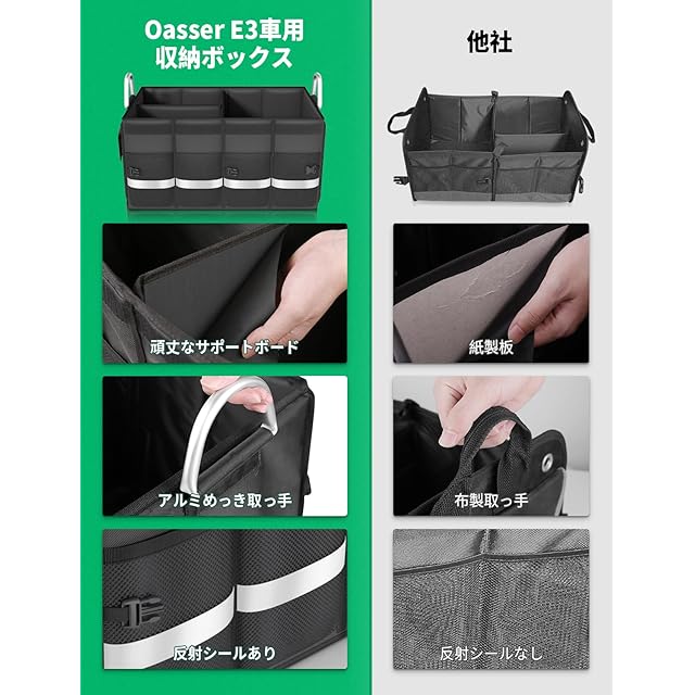 Oasser E3 車載収納ボックス 超大容量 折り畳み式 頑丈 崩れにくい 仕切り付き アルミめっき取っ手 反射シール マジックテープ滑り止め カーバー付</br>製品紹介</br>1680Dオックスフォード防水生地使用、丈夫で崩れにくい、傷つきにくい、洗浄しやすい。仕切り2枚あり、需要に応じ空間カスタマイズできる、使わない時は畳むことでスペースを節約できる、半分畳んで半分使うことだって可能4つのサイドポケットあり、小物を入れられる。アルミめっき取っ手を採用、重い荷物を持ち運ぶ時手に優しい、より握り心地がいい。