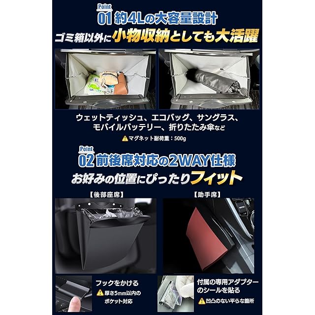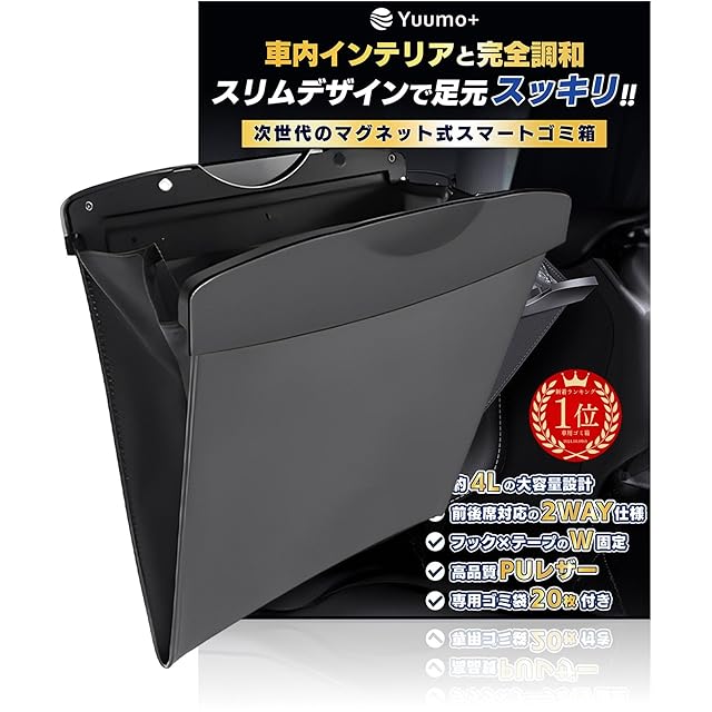 ✅【次世代のマグネット式スマートゴミ箱】車内インテリアと完全調和する高品質PUレザーを採用したスリムな車用ゴミ箱。スマートにポイっと簡単ゴミ捨てを実現。約4リットルと大容量設計なので、小物・備品・お子様のおもちゃなどの収納としてもオススメ(マグネット耐荷重:500g)。後部座席はもちろん、付属の専用アダプターで運転席・助手席側にも簡単取付。車内スペースを最大限に広げ足元スッキリで、あなたのカーライフをさらに充実させること間違いなし。