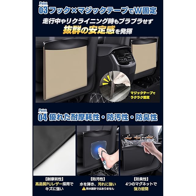 ✅【フック×マジックテープのW固定で抜群の安定感】後部座席のポケットに差し込むフックとシート下部に貼り付けるマジックテープで座席にぴったりフィット。走行中の揺れやリクライニング時もブラブラせず、抜群の安定感を発揮。ストレスフリーなドライブへ。