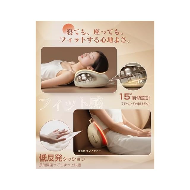 【人間工学設計×快適フィット】体のラインに沿うM字カーブと中央のU字ライン、さらに試行錯誤で導き出した15°の前傾設計により、腰・背中・首・肩に心地よくフィットします。リクライニング時も隙間ができにくく、くつろぎ姿勢をしっかりサポート。高反発クッションが体圧をやさしく分散し、長時間使用でも疲れにくい快適さを実現。腰や背中、肩、ふくらはぎなど、様々な部位に自由に使える柔軟な設計です。