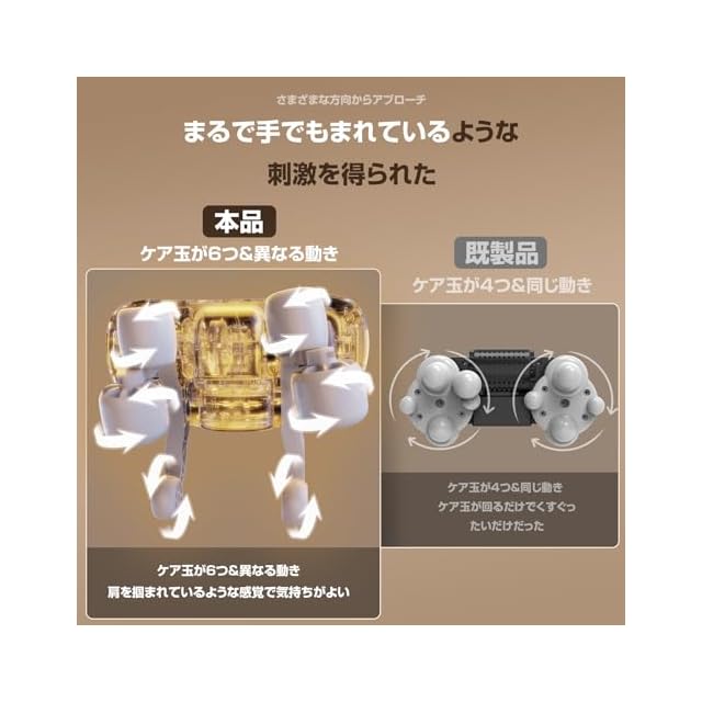 【広範囲を刺激】既製品に比べてもっと強く、気持ちいい“ケアアーム”を搭載。従来品は肩のみのケアでしたが、このリラクゼーション器のケア範囲は肩甲骨まで広がります。スッキリ感を得やすく!