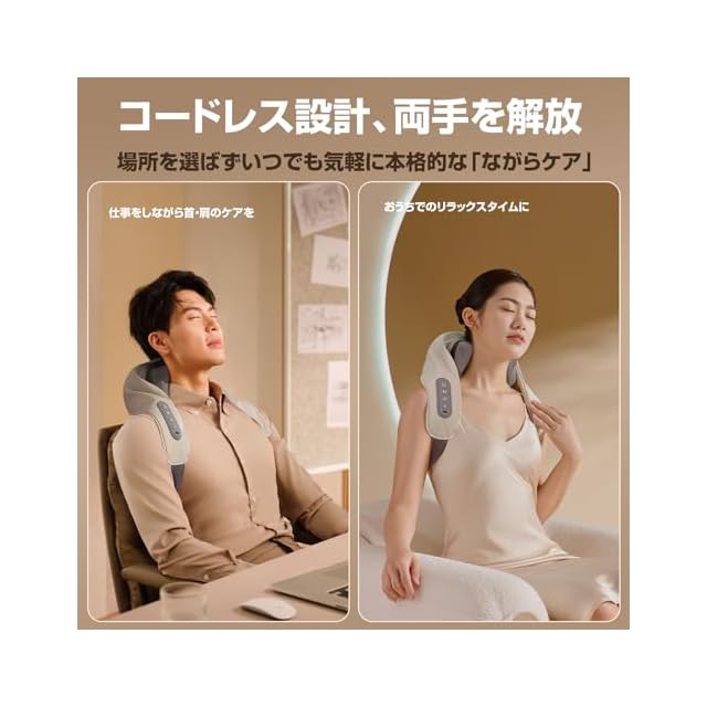 【コードレス設計、両手を解放】USB-C充電式設計で、使用時に電源に接続する必要はありません。仕事中に椅子に座りながら、リビングでテレビを見ながら、ソファに横になりながら……など、ながら使いしたい人は、やはりコードレスで使えるネックリラクゼーション器が便利。バックルストラップのデザイン、手で引っ張る必要がなく、手を解放します。仕事をしながら肩や首のケアができます。