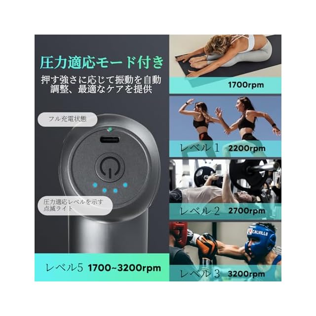 【ワンタッチで操作簡単&5段階振動レベル調節可能】arboleaf筋膜リリースガンは、ハンドルの下部に1つのボタンが装備されており、すべての操作をワンボタンで簡単に制御できます。1700~3200回/分の振動強度調整機能を搭載しており、お好みに合わせて振動の強さを調整できます。1~4レベルは手動モードで、5レベルはAIスマートセンサーを備えた自適応モードとなっており、筋肉に押し当てる強さに応じて振動の頻度を自動で調整します。充電には付属のUSB Type-Cケーブルをご使用ください。充電規格はType-C, DC 5V/2Aです。