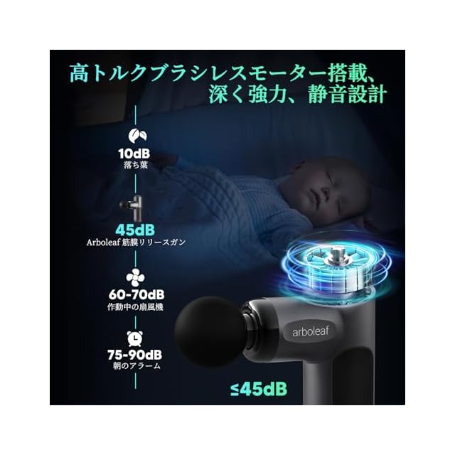 【低騒音リリースガン】ハイエンドのブラシレスモーターを搭載しており、ノイズを低く抑えています。最大3200rpm/minでの作動音も45dB(日常会話の程度)未満と非常に低騒音です。静音でジムや自宅で使用しても、周りの方にご迷惑をかけることなく、いつでもどこでも使用を楽しむことができます。