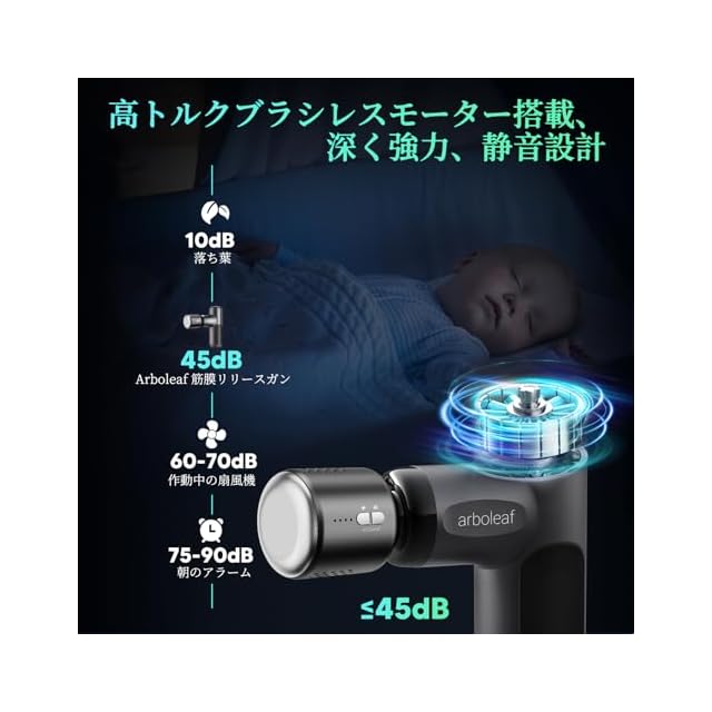【低騒音リリースガン】ハイエンドのブラシレスモーターを搭載しており、ノイズを低く抑えています。最大3000rpm/minでの作動音も50dB(日常会話の程度)未満と非常に低騒音です。静音でジムや自宅で使用しても、周りの方にご迷惑をかけることなく、いつでもどこでも使用を楽しむことができます。