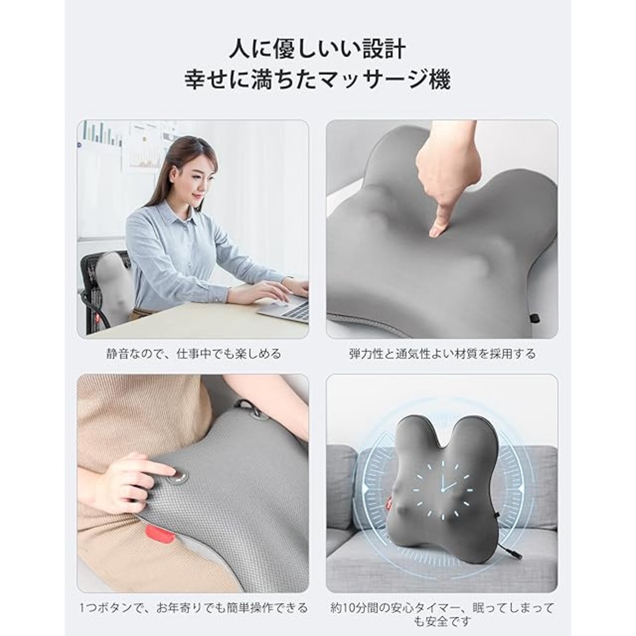 【人に優しい機能&プレゼント最適】1つボタンでお年寄りでも簡単に使えるマッサージクッションです。静音なので、仕事中でも楽しめる。10分間自動オフおよび過熱保護装置も付き、安心に使えます。プレゼントとして、お誕生日、正月、クリスマス、母の日、父の日、敬老の日、など様々なシーンで是非ご活用ください。