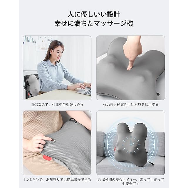 【ひっくり返して、もみ位置チェンジ】上下を使い分けすることで「もみ位置」が変わり、肩、背中と腰のコリを的確にほぐします。クッションを180度に回転させると、筋肉にかとなる刺激を味わい、意外な気持ちよさが発見できます。クッション部分は肌触りよい生地が採用され、通気性が優れ、見た目もよいです。