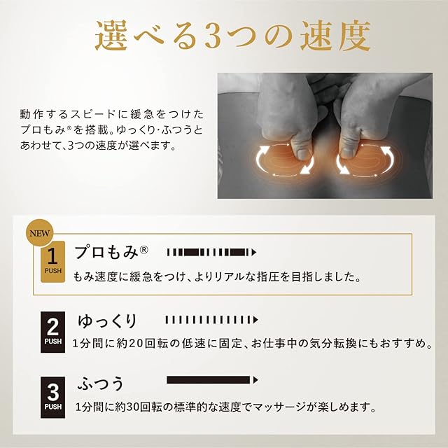 【選べる3つのモード】自動切替・左右対称に加え、左右を交互に動作するマッサージも可能になりました。【選べる3つの速度】動作するスピードに緩急をつけたプロもみを搭載。ゆっくり・ふつうとあわせて、3つの速度が好みで選べます。