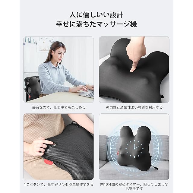 【ひっくり返して、もみ位置チェンジ】上下を使い分けすることで「もみ位置」が変わり、肩、背中と腰のコリを的確にほぐします。クッションを180度に回転させると、筋肉にかとなる刺激を味わい、意外な気持ちよさが発見できます。クッション部分は肌触りよい生地が採用され、通気性が優れ、見た目もよいです。