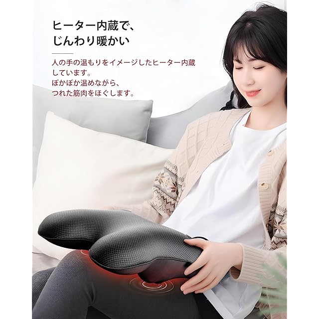 【ヒーター内蔵でじんわり暖かい】人の手の温もりをイメージしたヒーター内蔵しています。4つのもみ玉が約40℃に加温し、ポカポカ温めながら、疲れた筋肉をにリラックスさせます。寒い日にも楽々にします。