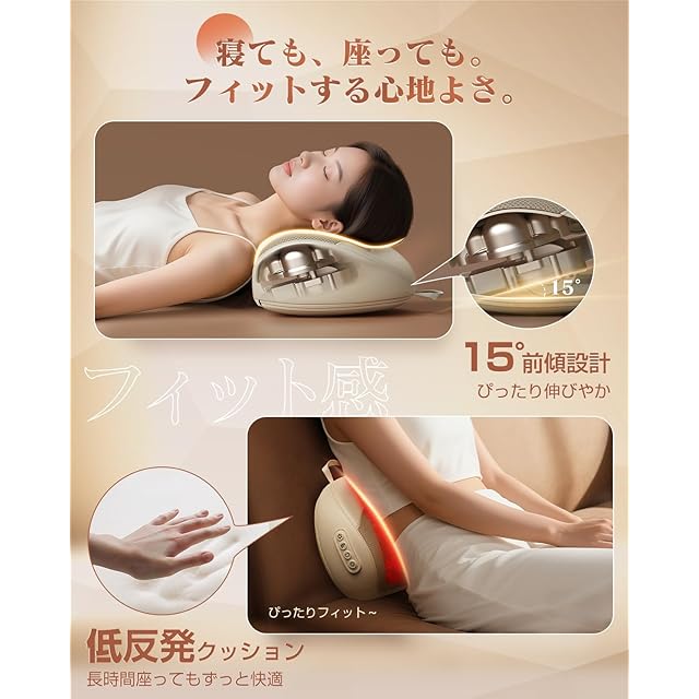 【人間工学設計×快適フィット】体のラインに沿うM字カーブと中央のU字ライン、さらに試行錯誤で導き出した15°の前傾設計により、腰・背中・首・肩に心地よくフィットします。リクライニング時も隙間ができにくく、くつろぎ姿勢をしっかりサポート。高反発クッションが体圧をやさしく分散し、長時間使用でも疲れにくい快適さを実現。腰や背中、肩、ふくらはぎなど、様々な部位に自由に使える柔軟な設計です。