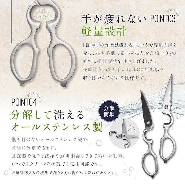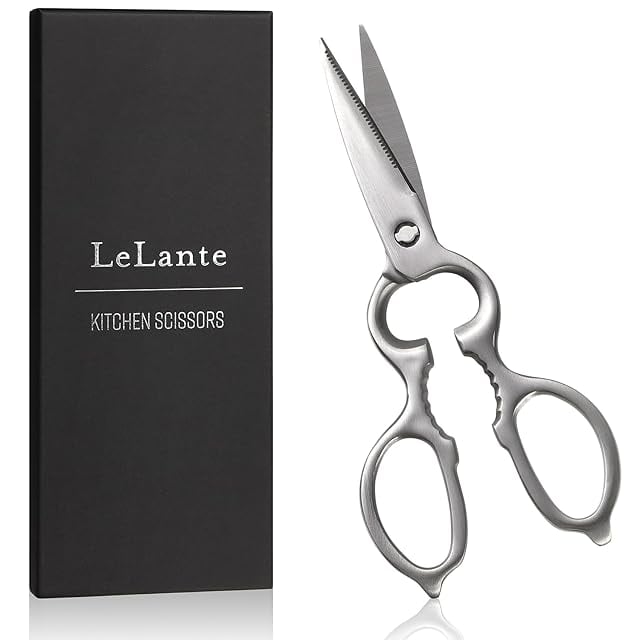 【選ばれる理由】 LeLante キッチンハサミ がついに正式販売開始。ギザ刃加工で食材の断面も綺麗な切り口に。 また、硬度の高いステンレス素材を使用しているので耐久性に優れ、硬いお肉の筋や骨、乾物系も簡単にカットできます。