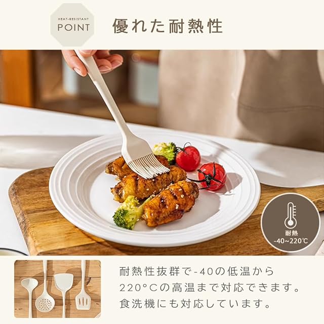 【収納便利】食器洗い機、食器乾燥機にも対応しています。素材がシリコン製ということで結構軽いです。取っ手にフックを掛ける穴があるのでつるして置けるので収納もし易いです。便利な調理用品ツールです。