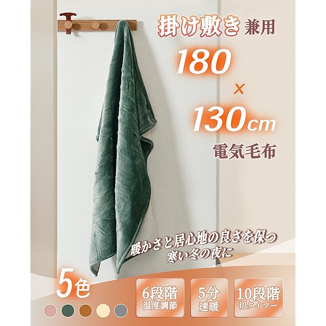 GOTCOZY 電気毛布 掛け敷き兼用 - 180×130cm フランネル電気ブランケット 6段階温度調整 10時間自動停止タイマー付 速暖 節電 丸洗い可能 暖房器具 防寒対策(グリーン)