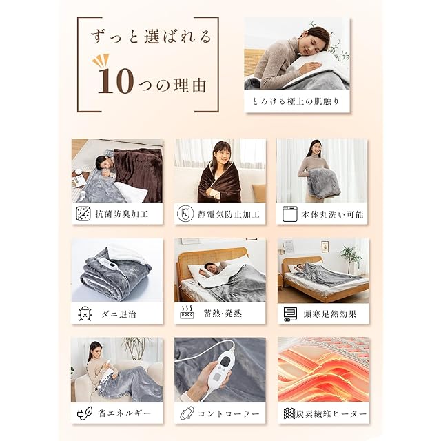 【最新の炭素繊維発熱線】内部には最新技術の炭素繊維発熱線が採用されており、優れた耐熱性と効率的な熱伝導を実現しています。これにより、まるで日光浴をしているかのような、自然で心地よい温かさを体感できます。また、消費電力が抑えられているため、省エネ効果も期待できます。安全性も高く、寒い季節に安心して長時間使用できる電熱毛布です。