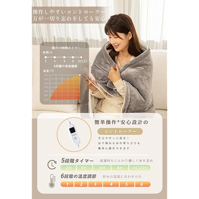 【タイマー付き&6段階温度調整】便利なタイマー機能と6段階の温度調節機能を搭載し、清潔で快適な使用をサポートします。タイマーは2、4、6、8、12時間の5つの設定から選べ、夜間使用時でも切り忘れを防ぎ、安心して快適な睡眠を提供します。また、6段階の温度調節機能により、体調や好みに合わせて最適な温かさを選択可能。最新の炭素繊維発熱線を採用し、熱が均一に広がることで肌にも優しく、清潔で心地よい温もりを感じられます。シーンや時間帯に合わせた調整が簡単にでき、日々の使い心地も抜群です。