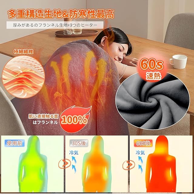 【10秒感熱&高品質発熱素材】電気毛布は高品質な耐久性が高くて、熱伝導性に優れいの炭素繊維ヒーターを発熱体として使用し、電気エネルギーを使用して遠赤外線加熱を生成します。電源を入れてから約10秒で暖かさを感じることができ、約3分で全身が徐々に温まっていきます。短時間で広範囲を均一に加温、より効率的に暖かくなります。多つの遠赤外カーボンファイバーヒーターを内蔵したこの電気毛布は、耐久性だけでなく、熱伝導性に優れており、短時間で均一に加熱することができ、加熱効率を大幅に向上させます。天候の変化にすばやく応答して、あなたに暖かさをもたらします。*毛布の内部には発熱材料が多いため、使用中に水に触れると回路障害を引き起こす可能性があります。