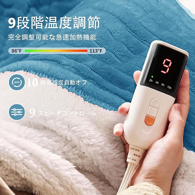 9段階の温度設定: 加熱毛布専用のデジタルコントローラーで、9段階の温度を簡単設定。高効率ヒーターワイヤーが素早く温めるため、寒い日もすぐにポカポカに。暖房毛布ならではの細かな調整で、お好みの快適温度を見つけられます。