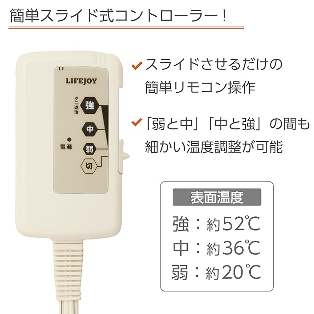【使い方が簡単でお得!】コントローラーのスライドで温度調節が感覚的にできます。 『弱・中・強』の三段階だけでなく、弱から中の間、中から強の間と細かい温度設定も可能です。 また電気代がかからないのも特徴です。「強」で運転しても、電気代は1時間あたり0.97円です。 8時間運転しても10円にも満たないので経済的な電気毛布です。