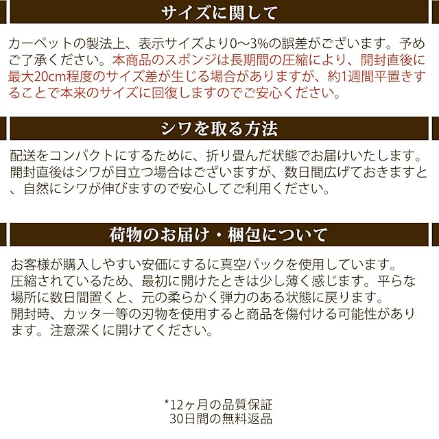 【品質】商品出荷前には日本国内にてしっかり検品を行っておりますので、ご安心ください。万が一カーペットに不具合がある場合は、1年間のが付いていますますので、お気軽に当店までご連絡ください。※お客様ご注意:商品輸送の際に折りたたんでお届けするため、開封時に折りジワ、歪み・寸法不足等の変形がありますが、一週間ほどご使用になれば、ゆっくりと回復します。製品サイズに個体差があるため表記サイズより1~3%の誤差がある場合がございます。