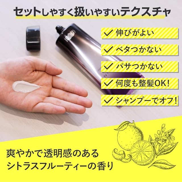 べたつかず、伸びがいいのでスタイリングも簡単に!フルーティーシトラスの香りは老若男女問わず好まれる香り◎