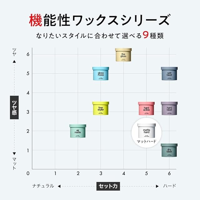 【リップスヘアー ワックスシリーズの永遠の定番商品 マットハード】一日崩れないハードなキープ力で、軟毛で立ち上がりが潰れやすい人でもラクに動く束感が再現できます。セミマットな質感でしっかりとした束感や立ち上がりが楽しめます。
