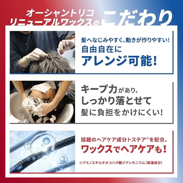 【Point:サロンワックスのこだわり】●フォロワーさんとサロンスタッフから既存ワックスの改善ポイントを集め、ユーザーの使用感に関する悩みを徹底的に改善!髪になじみやすく、アレンジ自由自在。/ ●話題のヘアケア成分トステアを配合。ワックスでヘアケアも可能!髪を保湿ケアしながらスタイリング!※アミノエチルチオコハク酸ジアンモニウム(保湿成分)/ ●ワックスの油剤に最適な処方を検討、改良し、洗い流しがしやすく髪に負担をかけにくい!