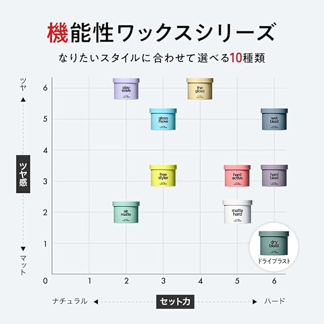 【ドライブラスト】スーパーマットなふわぼさ束感が自在に舞い散る、新感覚な超ドライワックス。スーパーハードなセット&キープ力、かつてない程のマット感!絶妙な軽さと硬さで、「ふわぼさ」なオシャレ束感をしっかりキープします。