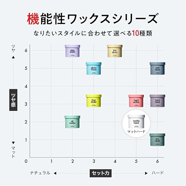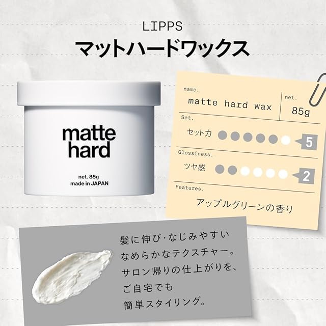 【リップスヘアー ワックスシリーズの永遠の定番商品 マットハード】一日崩れないハードなキープ力で、軟毛で立ち上がりが潰れやすい人でもラクに動く束感が再現できます。セミマットな質感でしっかりとした束感や立ち上がりが楽しめます。
