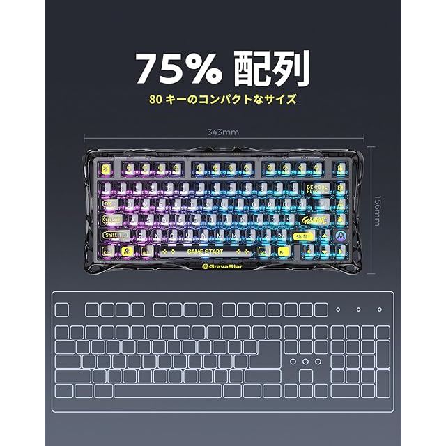 商品名:GravaStar K1 Lite ゲーミングキーボード 透明キーボード 無線 75%レイアウト テンキーレス ホットスワップ対応 ガスケット搭載 Bluetooth 5.0/2.4G/有線接続 透明キーキャップ RGBバックライト US配列メカニカルキーボード ワイヤレス Windows/Mac用 透明ブラック