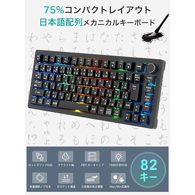 商品名:ゲーミングキーボード 2025年業界初 日本語JIS配列&かな印字一体化 75%コンパクト メカニカルキーボード ガスケットマウント/サテライト軸 押下圧40g PBTキーキャップ カスタマイズ可能 マルチノブ付き RGB LEDバックライト 1600万色 有線USB接続 Mac/Win対応 ブラック