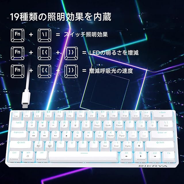 商品名:DIERYA ゲーミングキーボード 青軸 Mini 小型 メカニカルキーボード 60%レイアウト 61キー 英語配列 有線 キーボード 着脱式 USB C 電源ケープル WindowsノートパソコンおよびPCゲーマー向け (ホワイト)